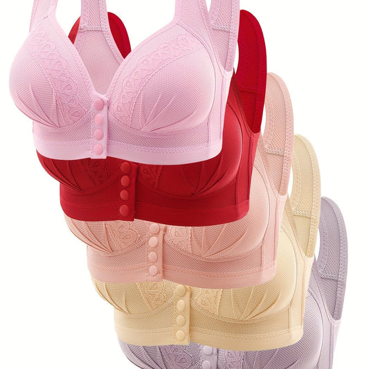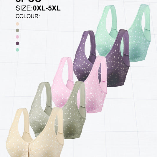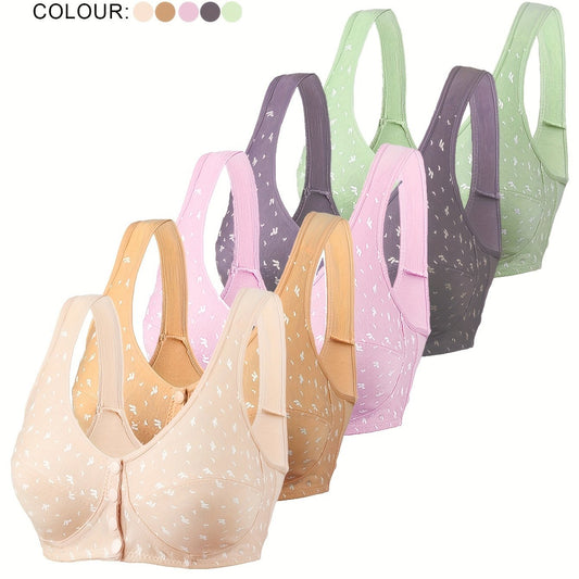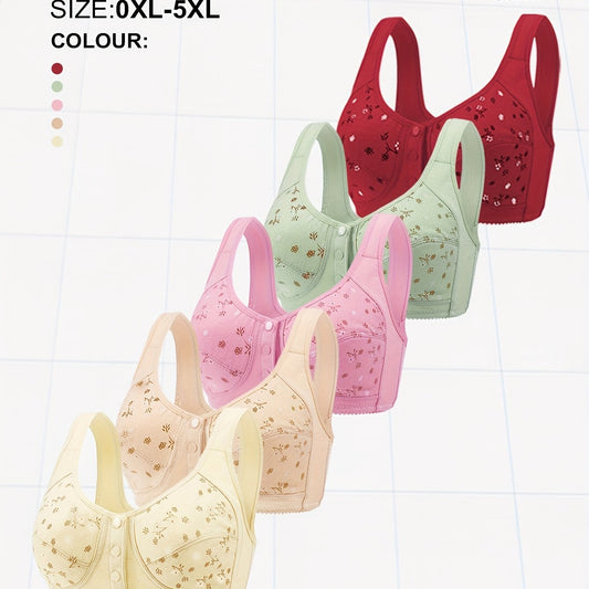 5pcs Plus Size Elegant Floral Print Bra - Full Cover Comfort Bralette with Front Button Closure