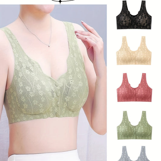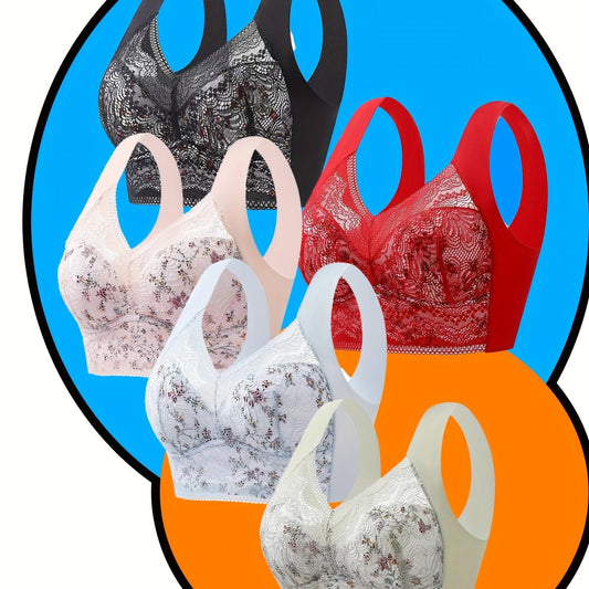 5pcs Elegant Lace Pattern Wireless Bras for Women, Comfortable Seamless Front Closure, Polyamide 80% Elastane 20%, Knit Fabric, Solid Color with Contrast Lace Detail