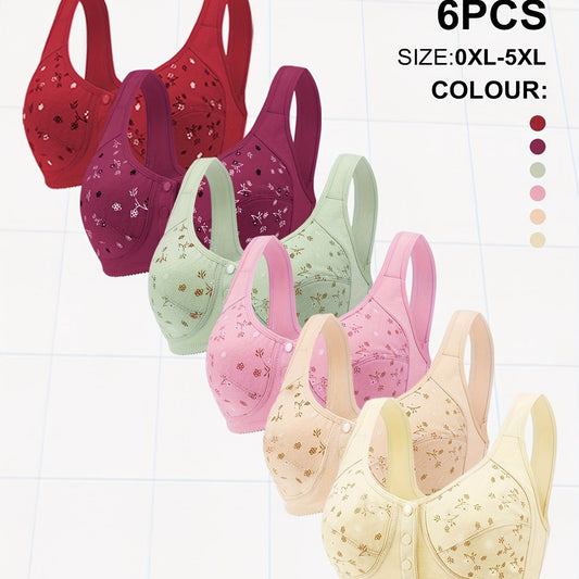 6pcs Women's Floral Print Front Closure Bralettes - Soft, Wireless Comfort Fit with Elegant Lace Detail