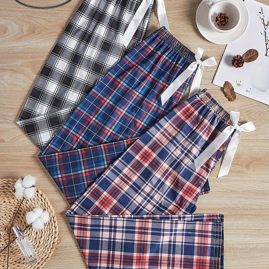 3 Pcs Elastic High Waist Casual Plaid Print Bow Detail Joggers, Women's Loose Fit Sleepwear & Loungewear Night Bottoms
