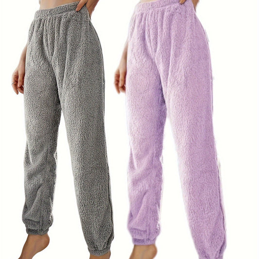 2 Pcs Fleece Casual Solid Night Bottoms, Elastic High Waist Jogger Sleep Pants for Fall & Winter,